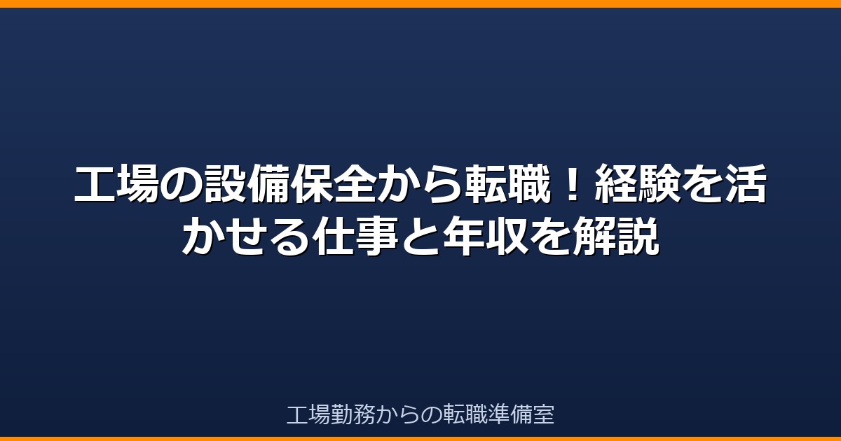 工場の設備保全経験は転職市場で高く評価される専門スキルです。プラント保全・フィールドエンジニア・ビルメンなど、経験を活かして年収を大幅にアップできる転職先が多くあります。電気工事士・機械保全技能士などの資格を武器に、転職エージェントと一緒に最適な転職先を探しましょう。