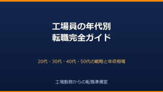 工場員の年代別転職戦略を1本にまとめた総合ガイド。20代はポテンシャル採用・未経験職種、30代は即戦力スキル、40代はマネジメント、50代は経験の深さで勝負。年収相場とおすすめ職種付き。